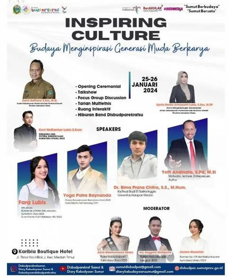 Kegiatan Inspiring Culture yang diwakilkan oleh Dosen Tetap Yayasan di Program Studi S1 Sastra Inggris yaitu Dr. Bima Prana Chitra, S.S., M.Hum., sebagai Speakers dengan memaparkan tema tentang “Budaya Menginspirasi Generasi Muda Berkarya”. Kegiatan ini diselenggarakan oleh Dinas Kebudayaan dan Pariwisata Provinsi Sumatera Utara pada hari Kamis-Jumat, 25-26 Januari 2024. Inspiring Culture merupakan kegiatan yang bertujuan untuk membangkitkan semangat generasi muda agar lebih sadar akan pentingnya kebudayaan yang ada di Sumatera Utara.
